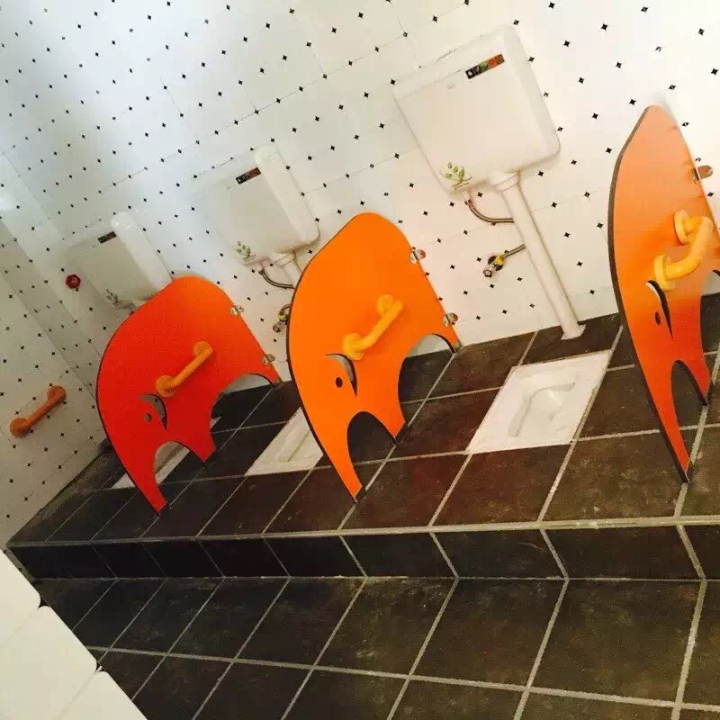 幼儿园的卫生间设计风格是越来越卡通可爱了,大象形状的隔断板真有创意,隔板上安装的是一字型儿童卫生间扶手,ABS尼龙材质,具有抗菌的特性,内部是不锈钢管,很结实耐用的哦!