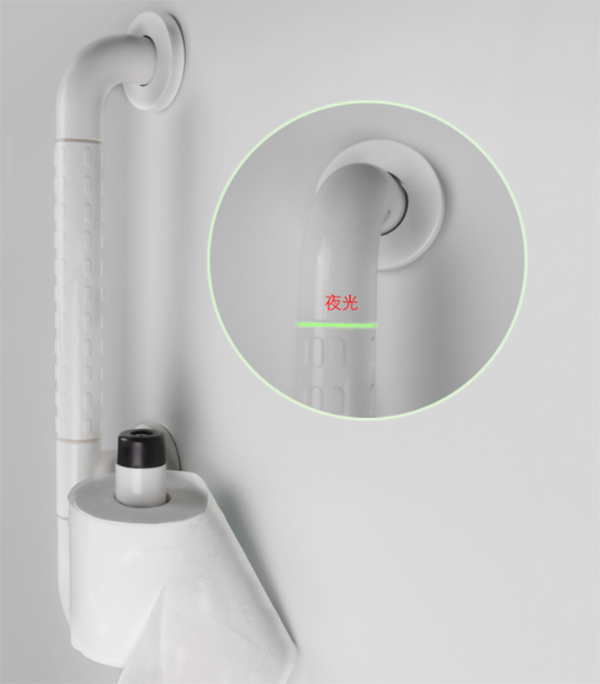 在一字型的基础上设计一个尼龙材质的挂钩可以挂一个卷纸安装在马桶旁边可以随着使用并且拉杆中间的位置设计了防滑颗粒不用担心会滑倒。