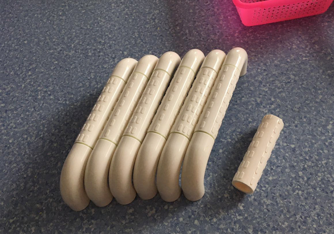 看看我们的半成品,不锈钢管我们都是整条的采购回来的,然后在按照扶手尺寸切成不同的长度,这些尼龙管颜色都是明亮的很呢,我们的师傅切的很整齐哦!尺寸、厚度也很足哦。。。