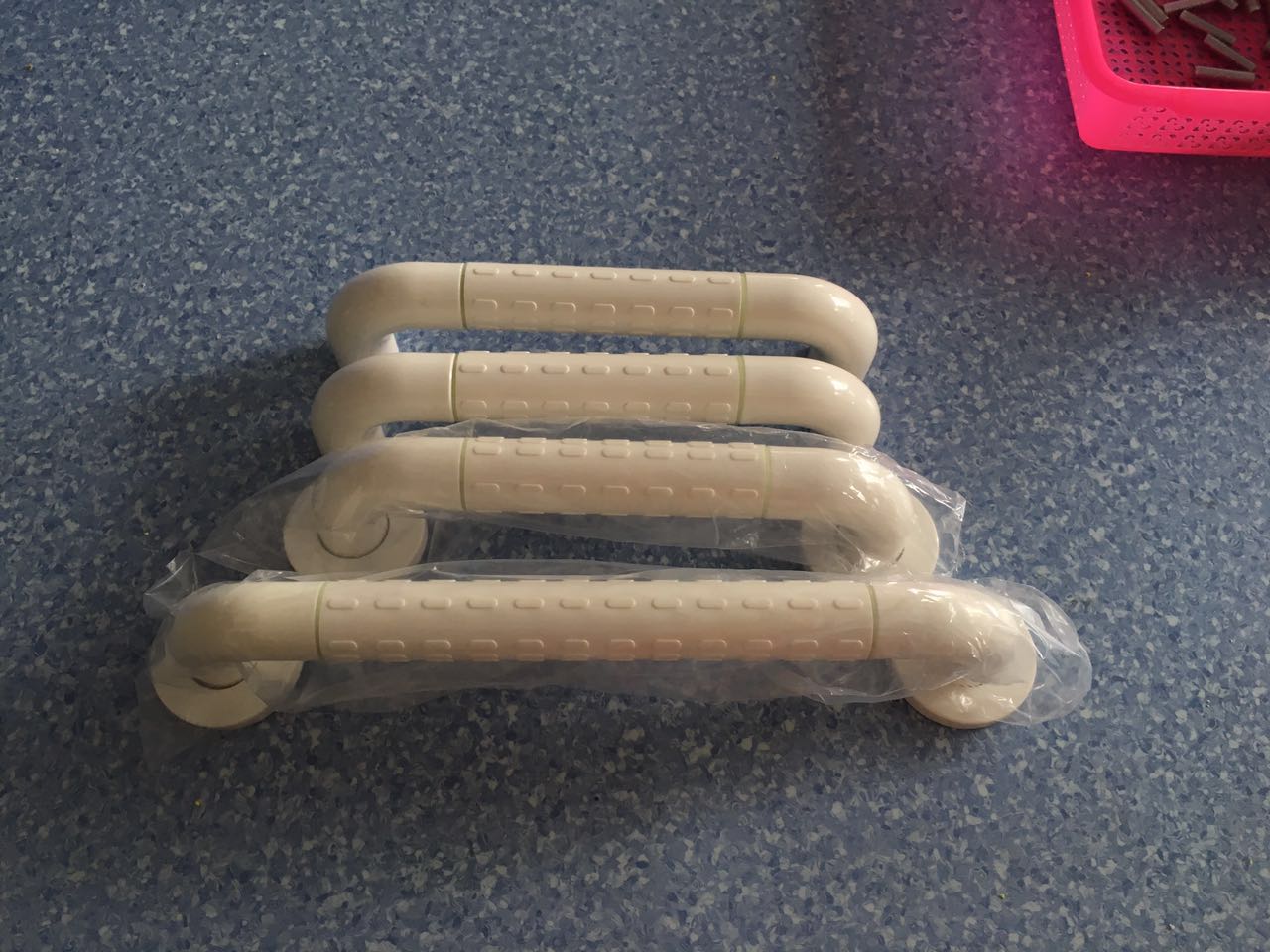 都是安装了弯头的一字扶手,是带夜光圈的,晚上或在光线较暗的地方都可以很清楚的找到它的位置。接下来,就是要安装螺丝口了,这一步做完一个一字扶手就差不多完工了。