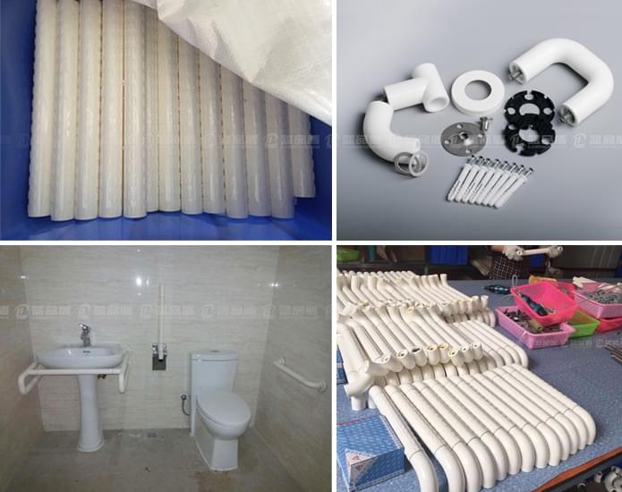 蓝品盾是卫生间扶手的生产厂家,我们有30多种款式可选的,尼龙外管的颜色有黄、白、蓝、绿四色可选,中间搭配的底座和连接件、螺丝等配件都是按照标准配送的。安装简便,直接在墙上打孔安装即可,后期的维修、保养和清洁都很方便的。