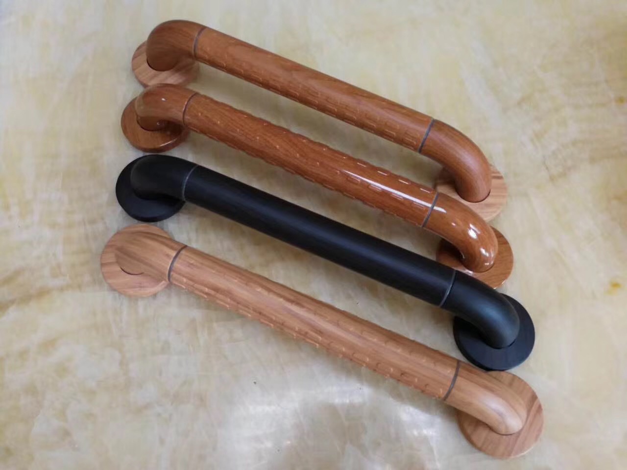 这几种水转印木纹色的扶手,连弯头都是同色的哦,我们的工厂从去年下半年也出了好几批这种颜色的货呢,客户们的反映都很好。