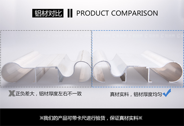 4、可以装饰样品拆开铝材对比,正负差大,铝材厚度左右不一致的不仅抗压力不强而且很容易掉落哦!而真材实料的铝材厚度都非常的均匀。