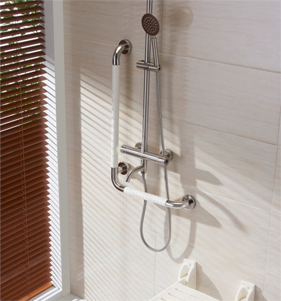 图上的卫生间花洒下方安装了一个无障碍卫生间扶手防滑的,款式是L型扶手不锈钢材质和尼龙材质完美结合而成,款式简洁大方,还具有很强的防滑效果安全在简洁的墙壁上,它的下方最好安装一个浴凳因为老人在洗澡的时候站久了会腿软,这个时候老人就可以座在浴凳上就不会摔倒了。