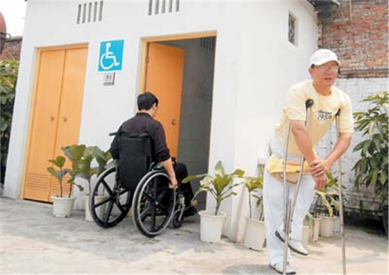何先生举例说,8月底,义务督察员在番禺疗养院上培训班时,就发生过被卡在无障碍洗手间里的尴尬事情。番禺疗养院无障碍设施已是比较完善的,无障碍洗手间也算宽敞,但可能是出于美观的考虑院方在马桶前面多加了一条横杠,这无形中给肢残人士制造了障碍,由于轮椅无法靠近马桶,肢残人士想要“方便”却很不方便。结果一个义务督察员在上洗手间时,就从轮椅上摔下来,卡在了马桶与横杠之间。